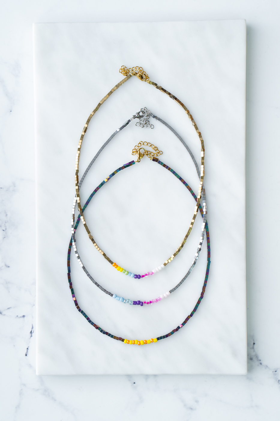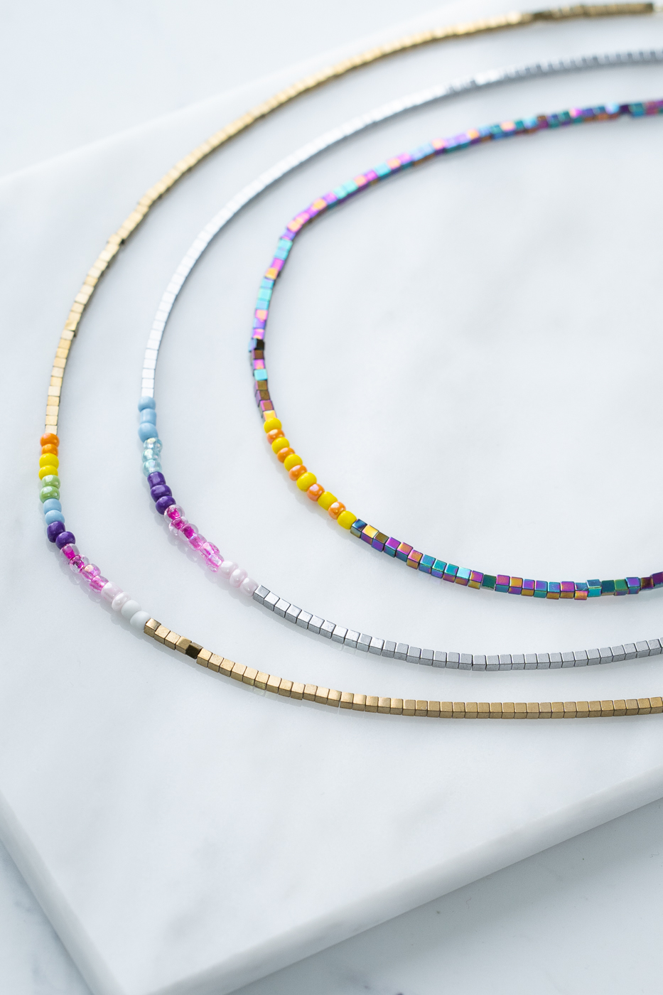 Ces courts colliers ras-de -cou combinent des perles en hématite et des perles de verres multicolores.