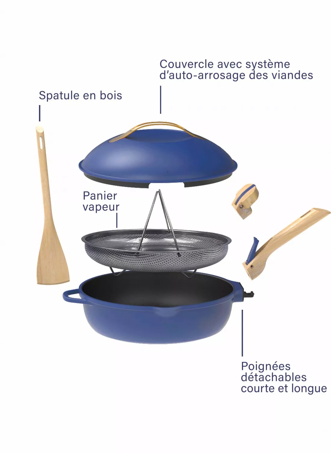 - remplace 8 ustensiles : poêle, sauteuse, casserole, cocotte, cuiseur vapeur, friteuse, plat au four, moule à gâteaux